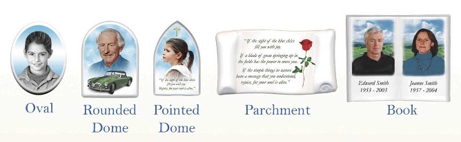 Zander Photo Ceramics...Photos really make a memorial special. Fusing an image into porcelain can make that photo last forever, and the quality is so good that the finished product exceeds the original. Clients often ask us for photo prints of the ceramics that they can keep at home. ...Shapes & Styles